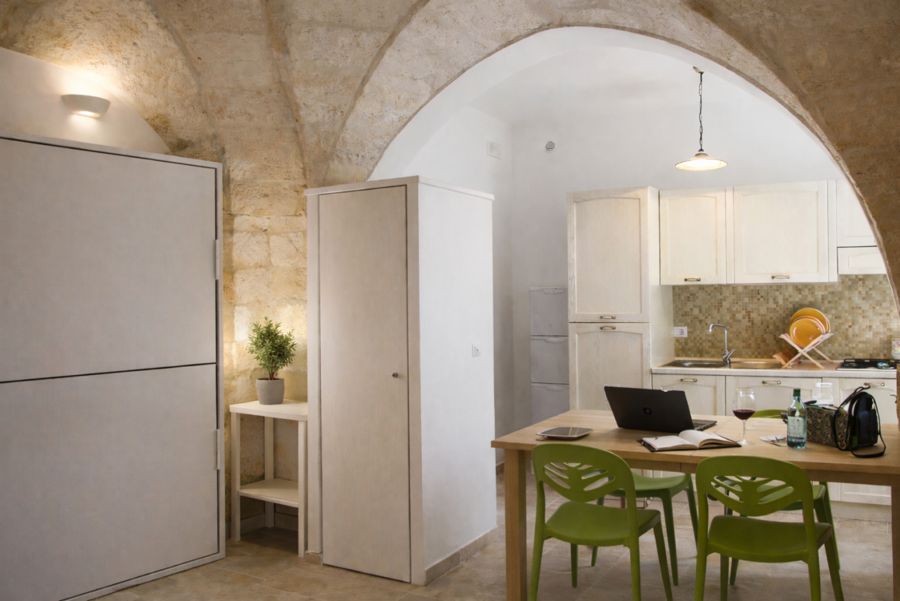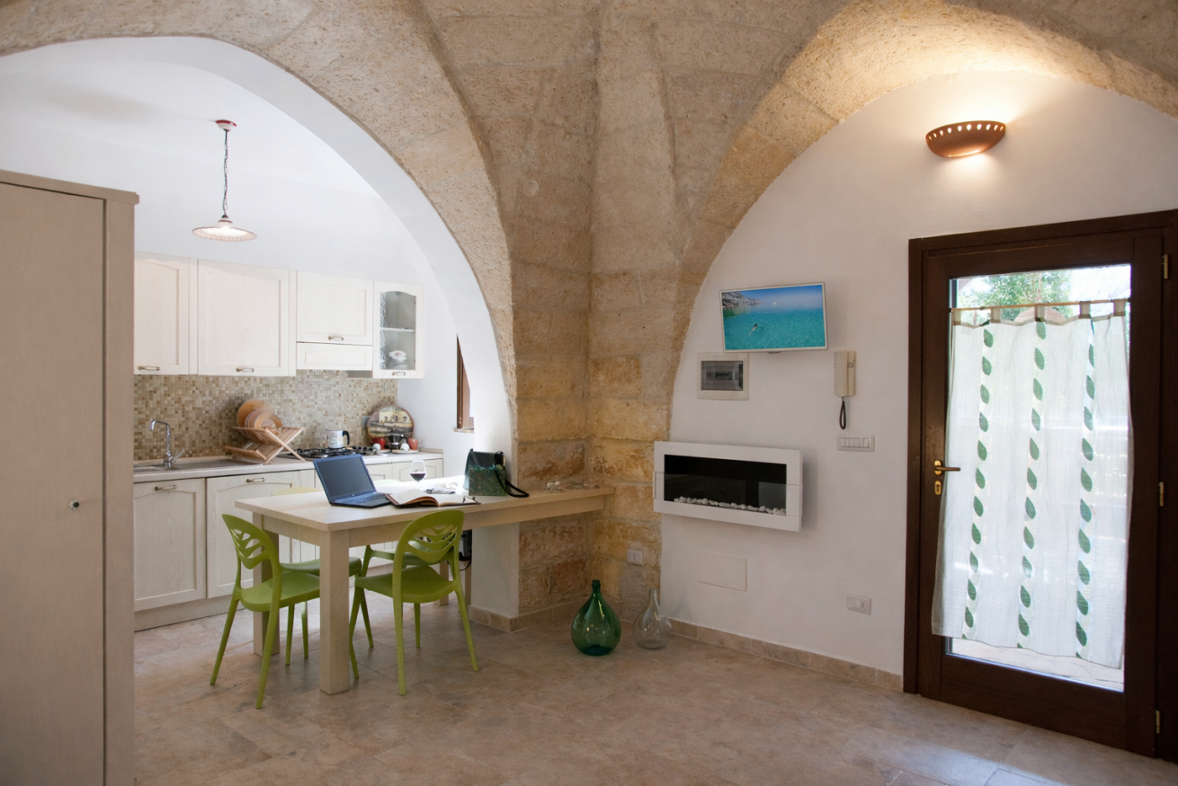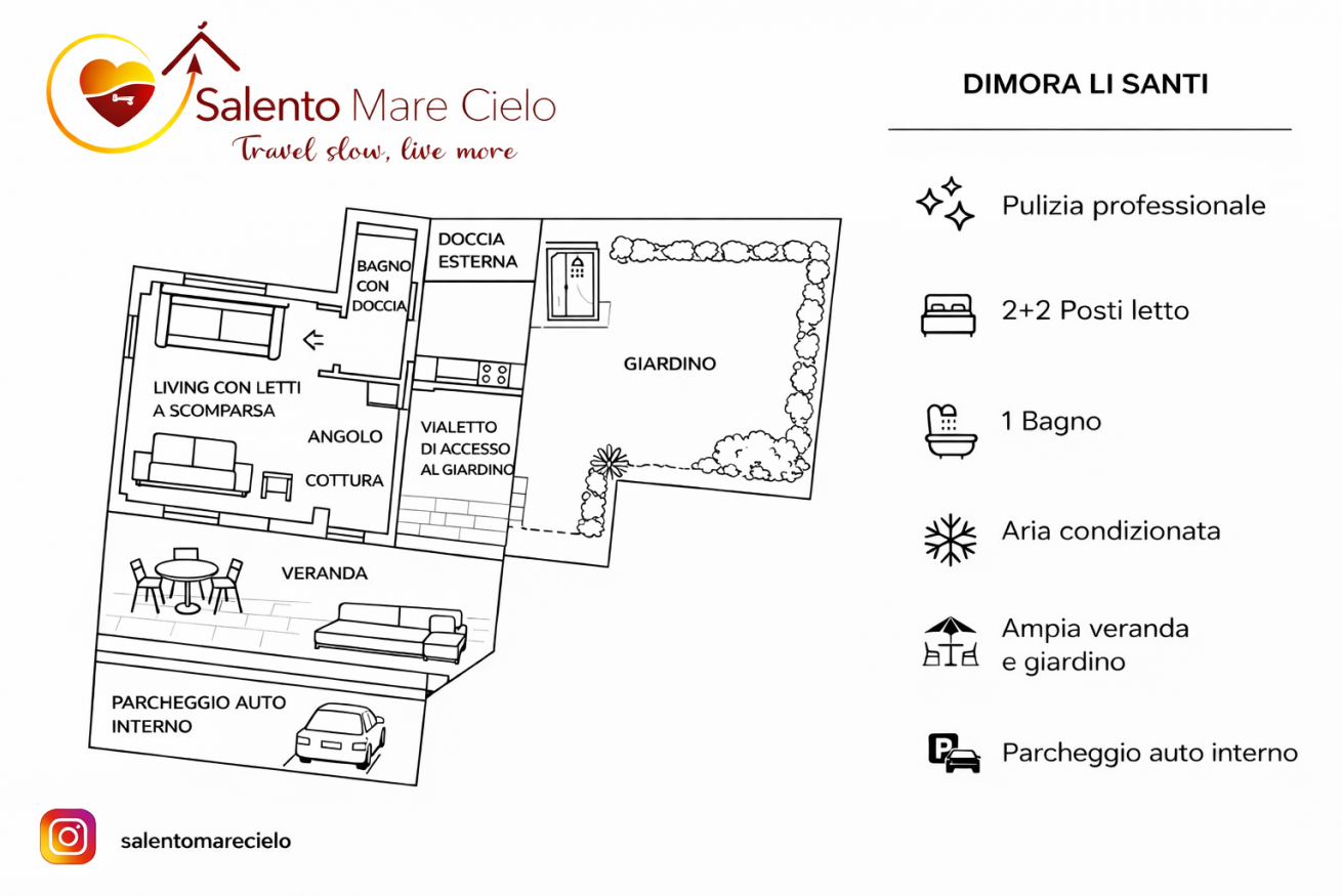 Dimora “Li Santi” è un rifugio autentico immerso nel cuore del Salento, nato da un’antica cava di tufo che custodisce conchiglie fossili come piccoli segreti del tempo. Il bilocale, al piano terra, accoglie con una suggestiva volta a stella a vista, angolo cottura attrezzato, comodo bagno con doccia e 2+2 posti letto. All’esterno, un ampio patio ombreggiato e un giardino profumato di gelsomino e rosmarino invitano al relax più puro. Tra ulivi e muretti a secco, a pochi passi dal mare di Santa Caterina e dal parco di Porto Selvaggio, ogni dettaglio racconta la bellezza del territorio. Qui, il tempo rallenta e si ritrova l’armonia.